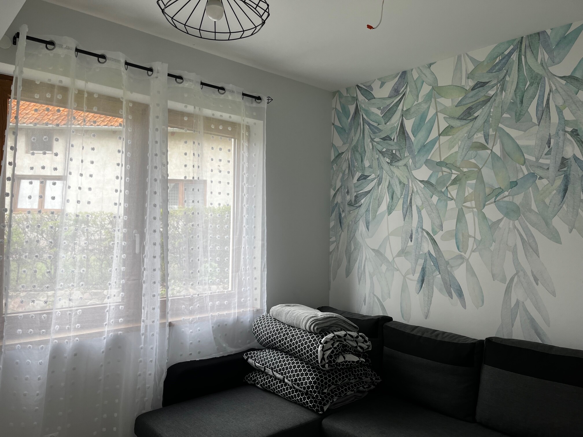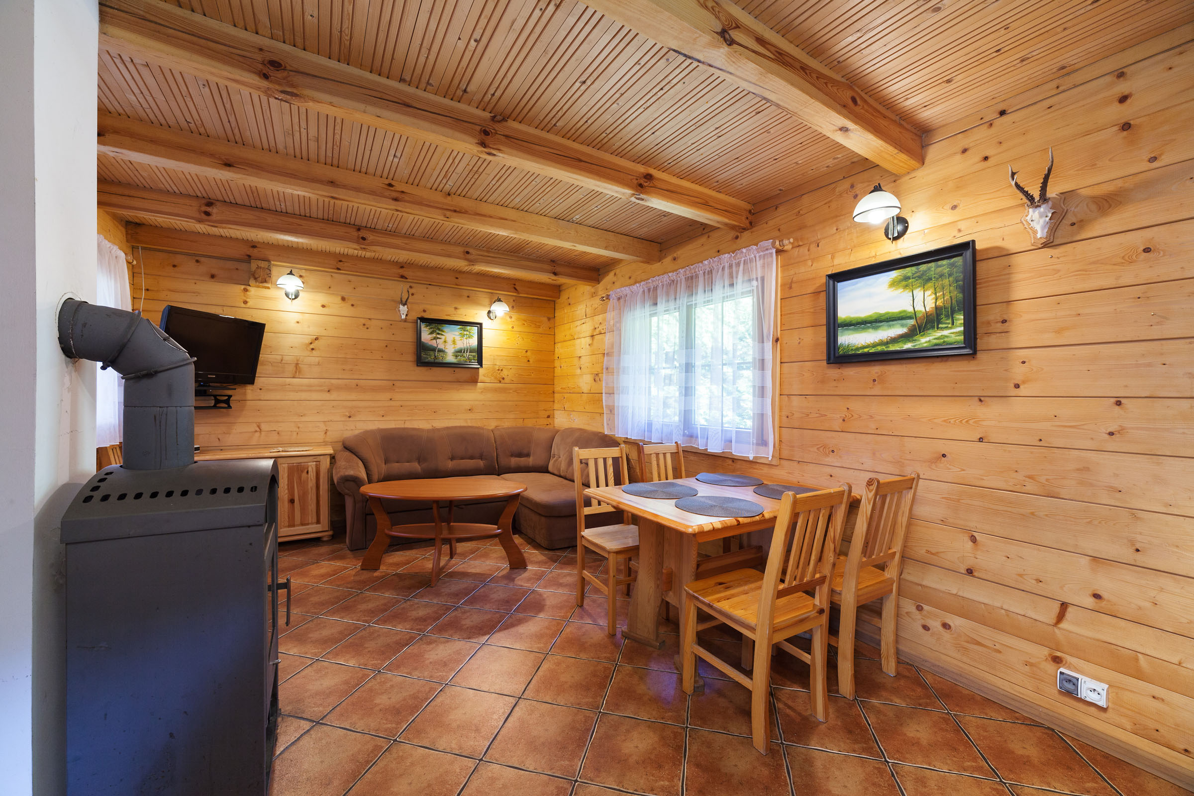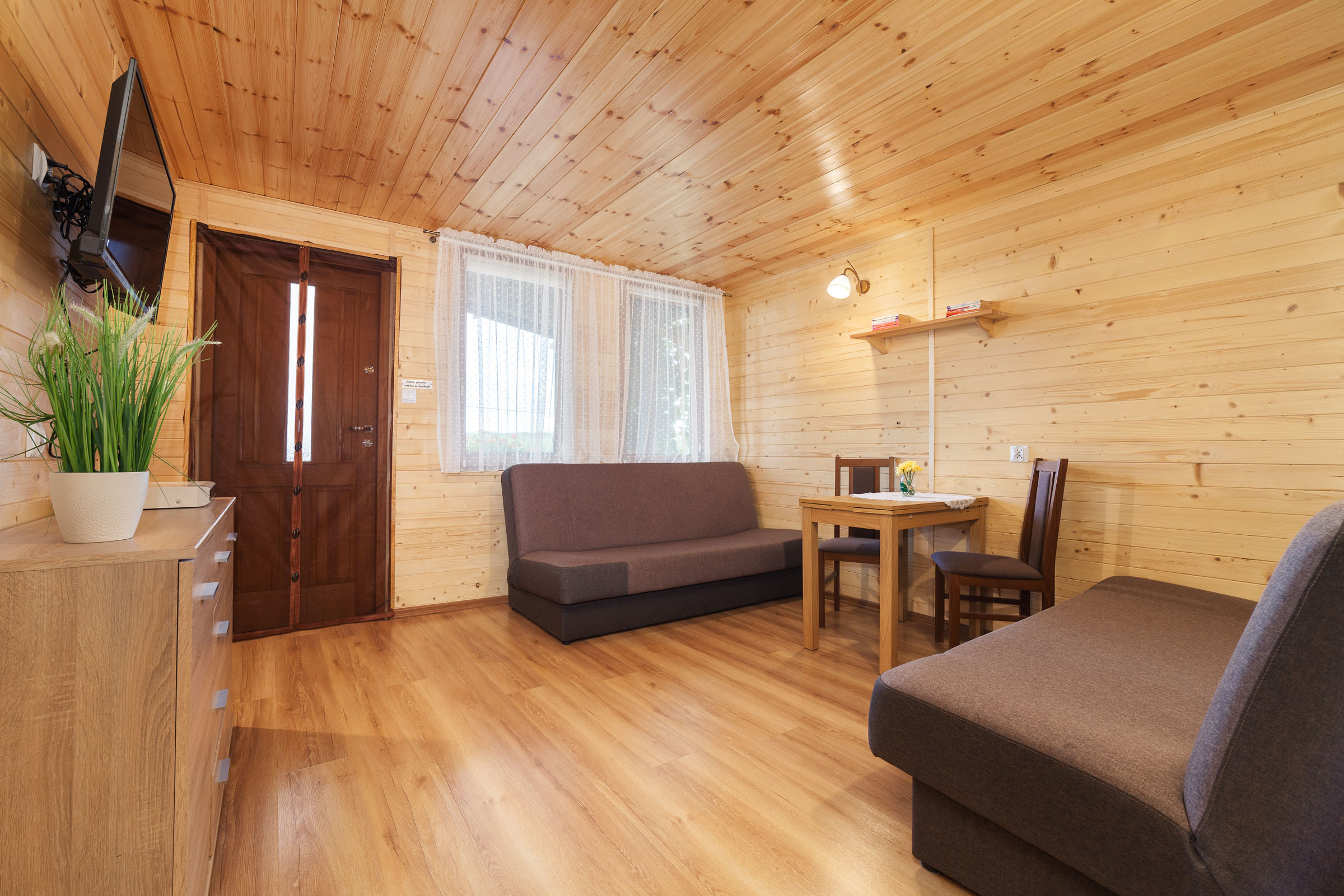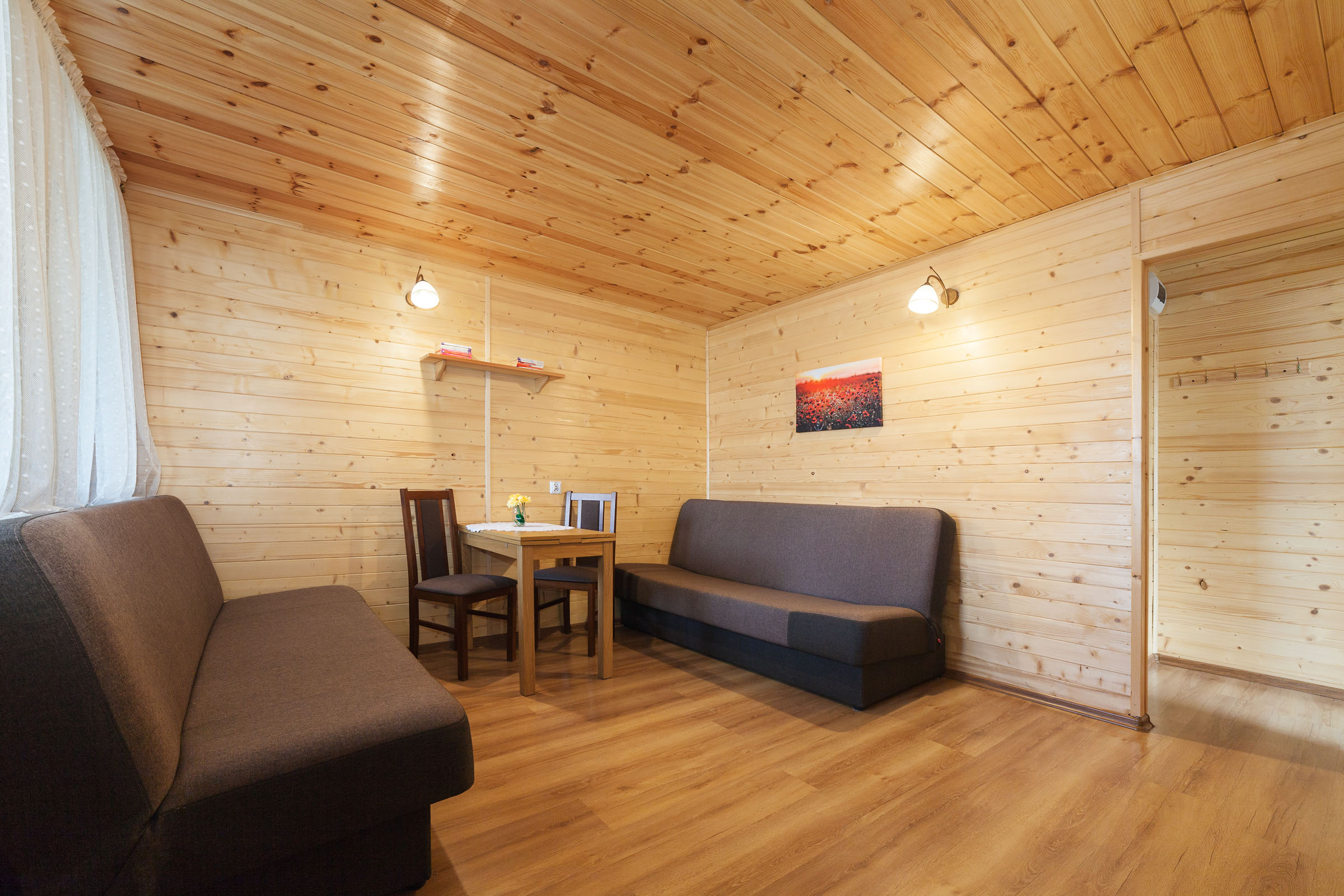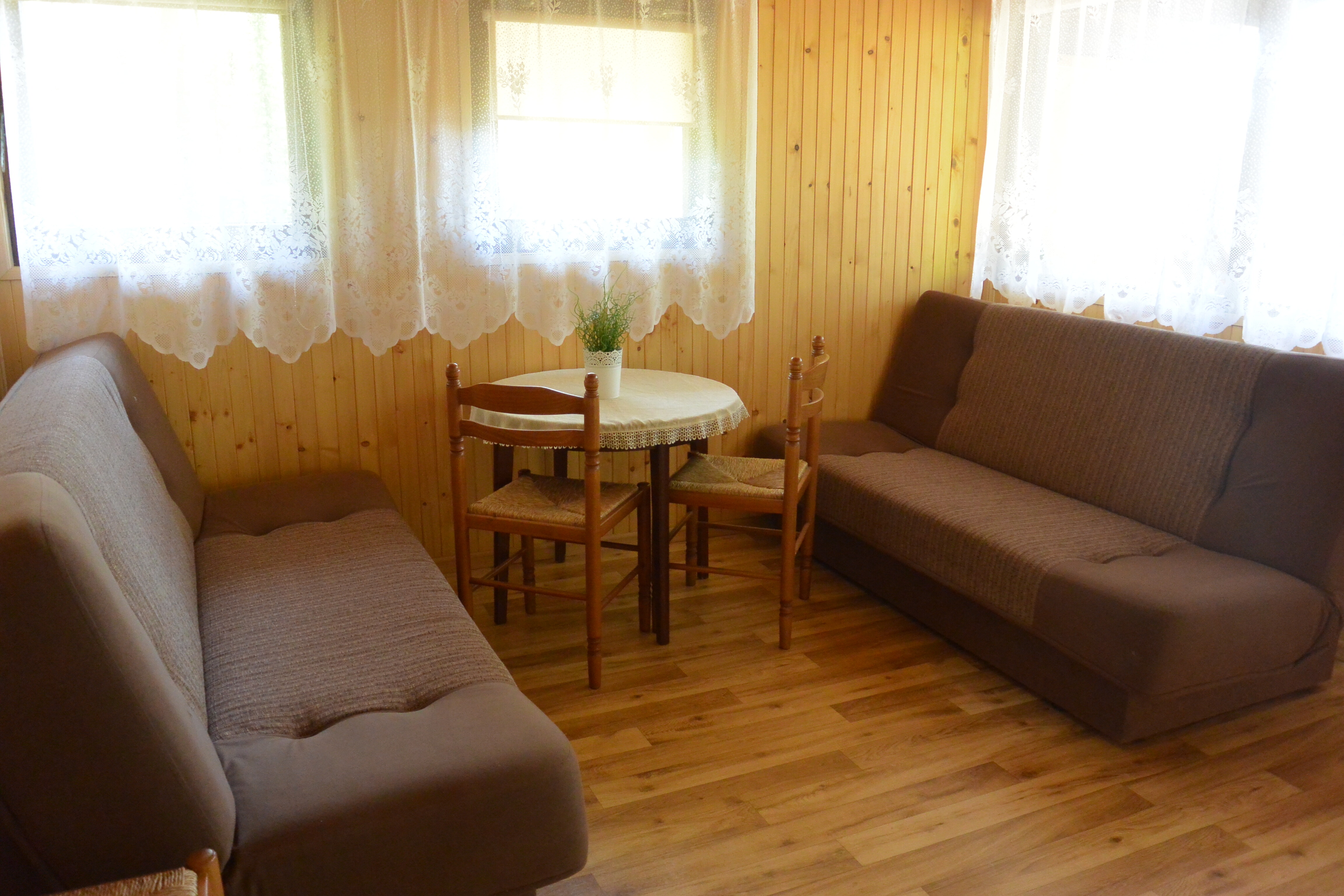 pokój z 2 sofami rozkładanymi, stolikiem i krzesłami