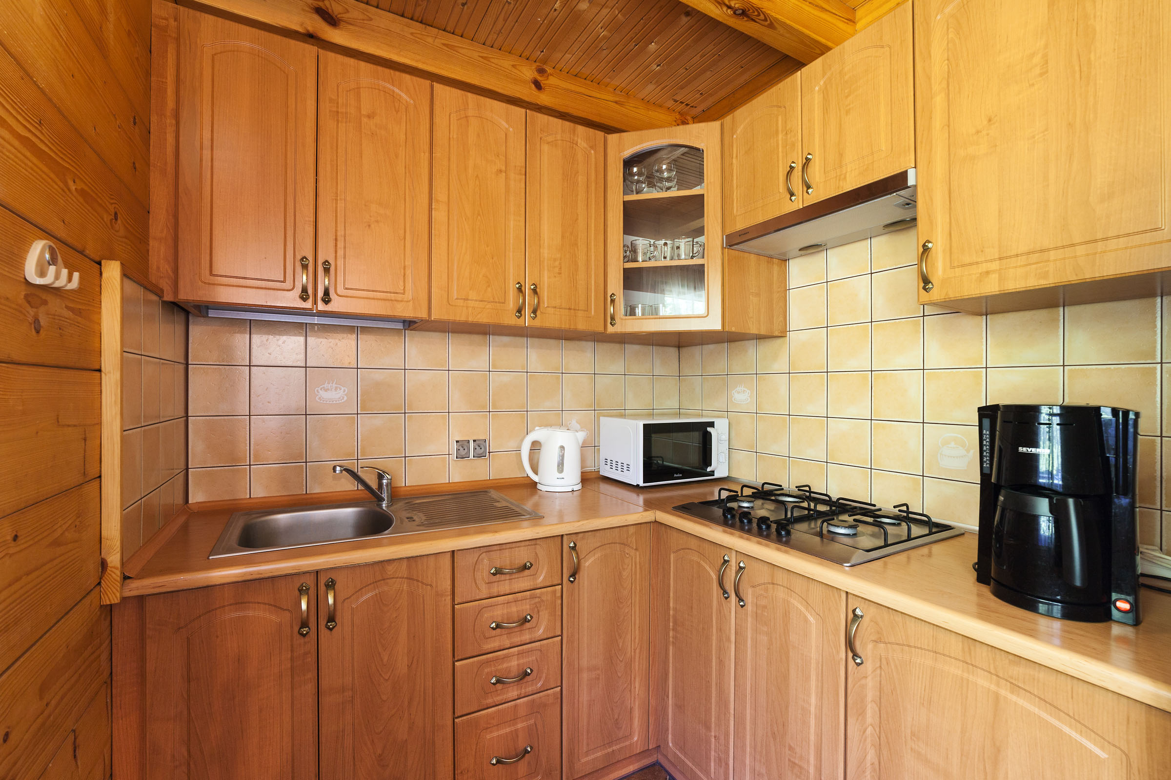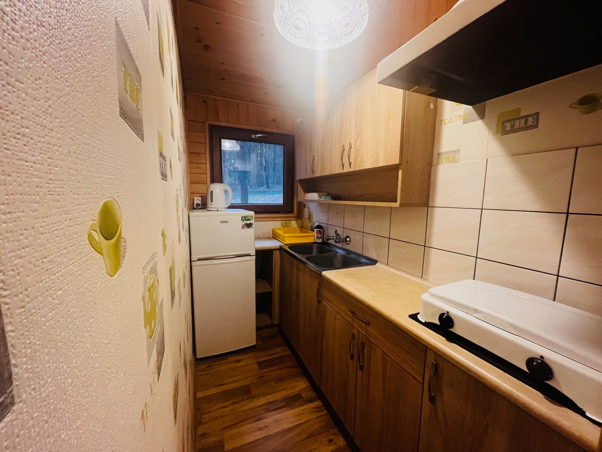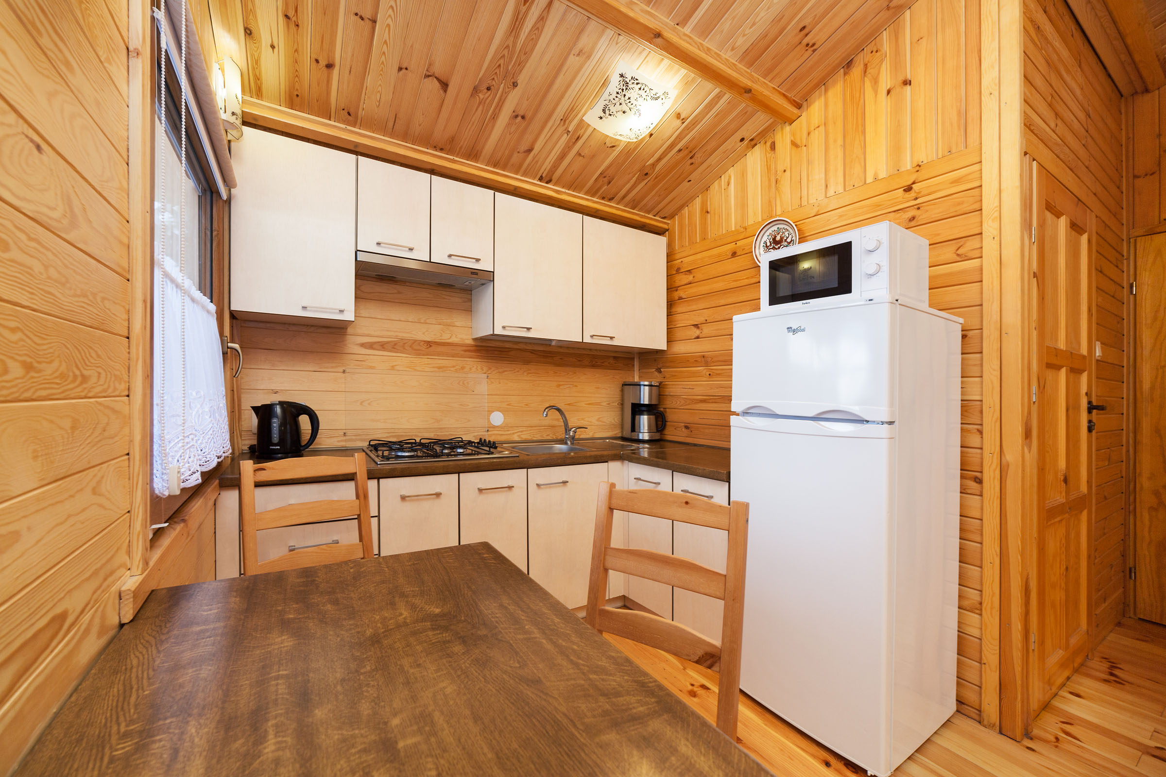 kuchnia wyposażoną w lodówkę, kuchenkę, czajnik bezprzewodowy i wszelkie inne niezbędne akcesoria (sztućce, garnki, talerze, itp.)